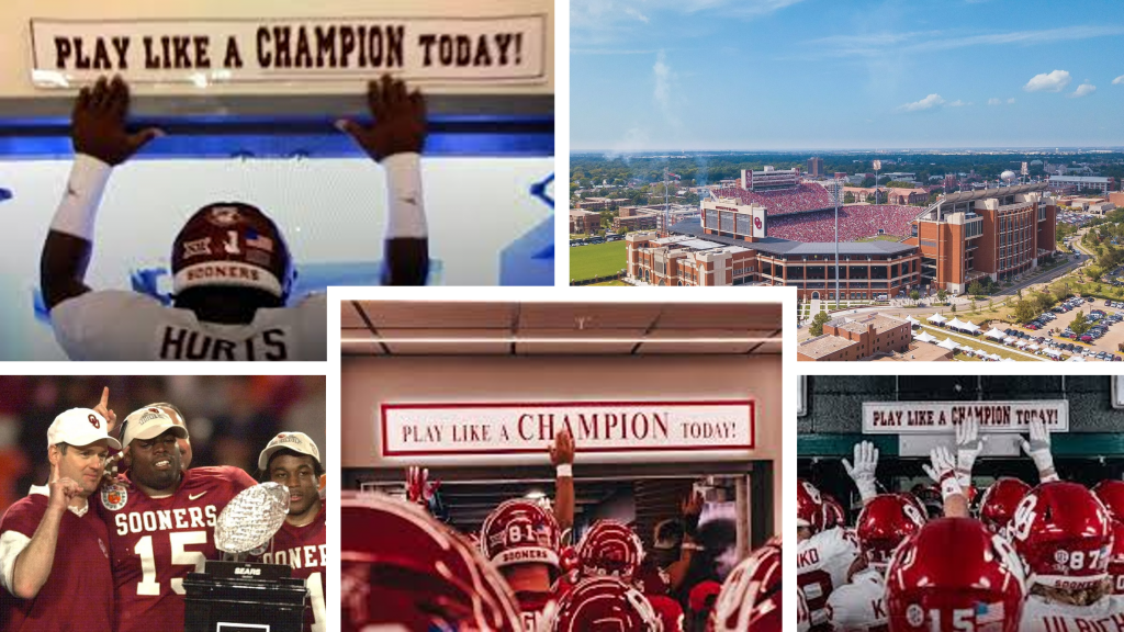 Just like the great tradition of the Oklahoma University football program itself, Sooners of all walks of life strive to perform like a champion. When aspiring scholars and athletes step on campus, they walk upon much of the same ground as champions did before them. By going into each classroom, lab, gym, or arena, Sooners aim to execute to the best of their abilities live “like a champion today!”