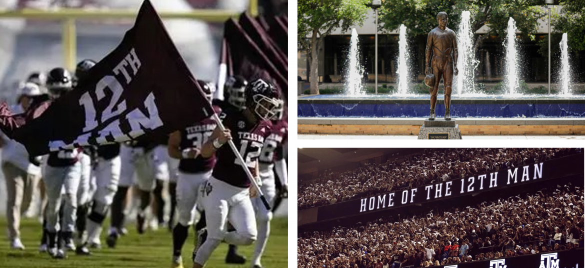 The power of the 12th Man is consistently demonstrated in the unity, loyalty, and willingness of Aggies everywhere to serve when called to do so. It may be most visible on gamedays, but students also embrace this spirit through generosity and service to their peers, community, and the world around them. Texas A&M has become known as the “Home of the 12th Man”, a name that embraces Mr. Gill’s simple gesture of school pride and readiness.