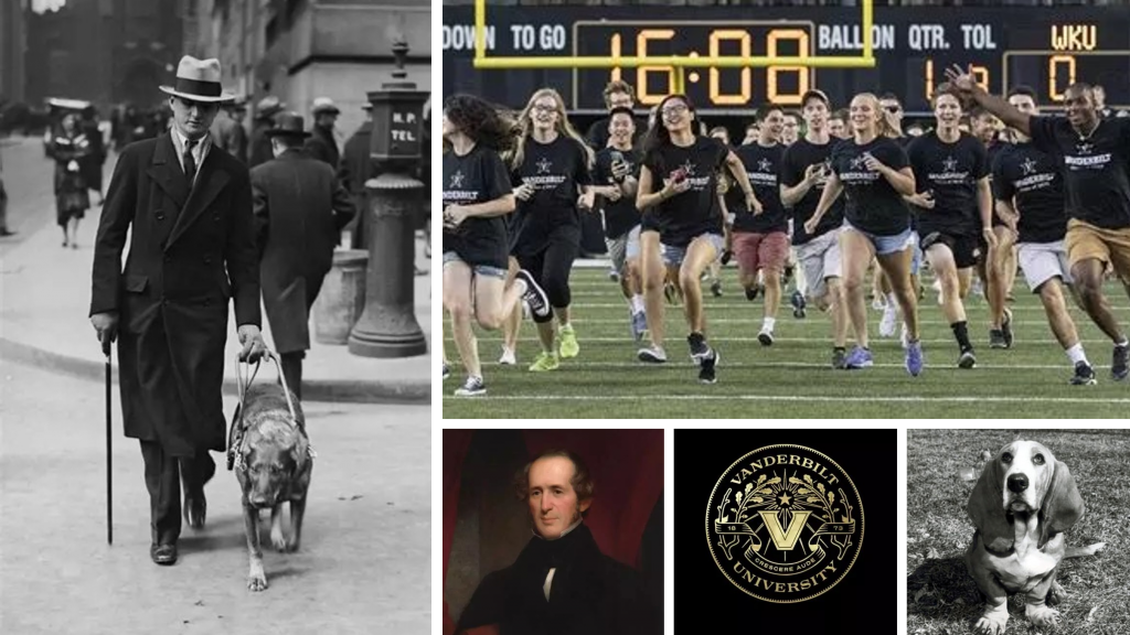 • In 1961, during the Vanderbilt v. U of Tennessee rivalry game, a Vanderbilt University Freshman’s basset hound named George, began chasing Tennessee’s Walking Horse, which was the Vols paraded around the field at certain points during the game. The crowd cheered George each time he did this. Subsequently, the student body elected George, Vanderbilt’s first official mascot. He served until his death in 1965.  R.I.P George!